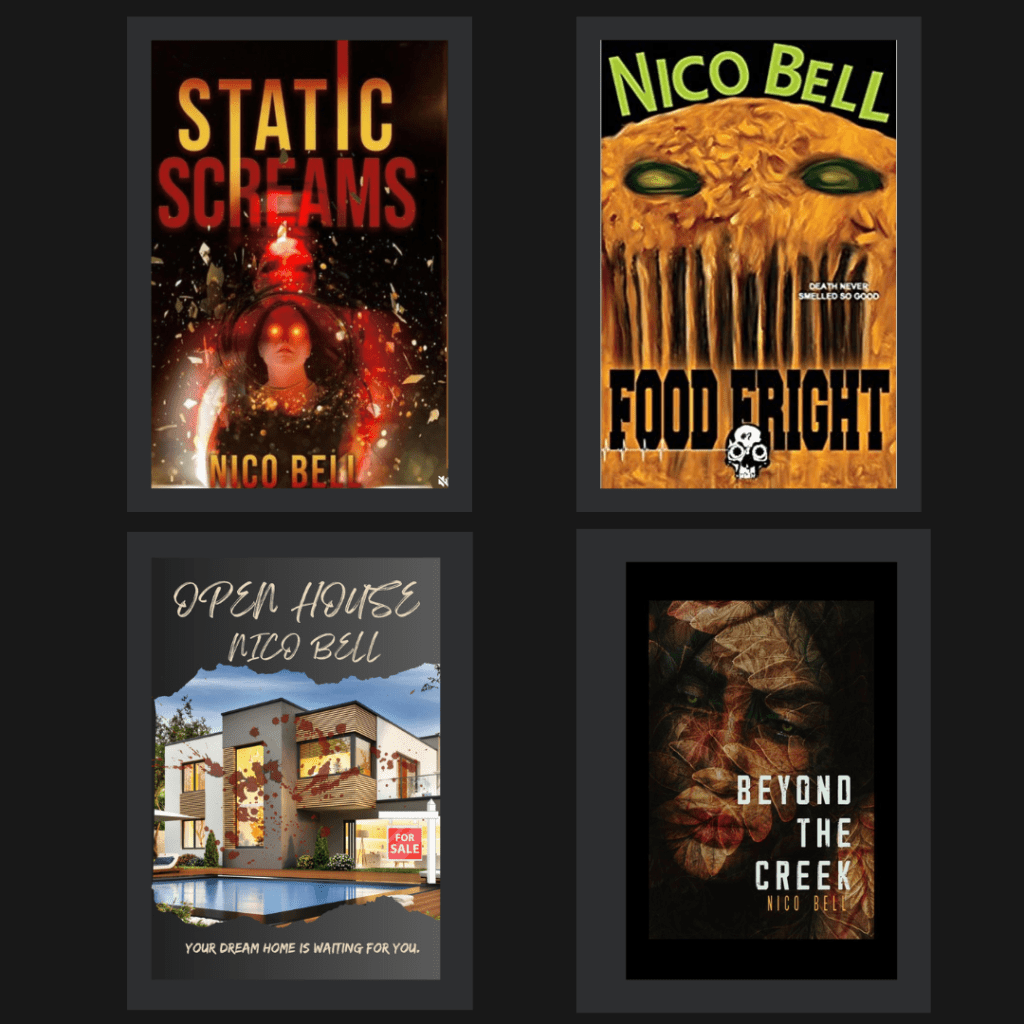 Her love of dark characters, sinister plots, and delicious mayhem led Nico towards her true passion: horror. Her debut horror book Food Fright was released in 2020 and was a semi-finalist in the 2020 Bookish Jazz Awards, Adult Fiction Category for Horror. She has gone on to publish several other books including Beyond the Creek and Open House.