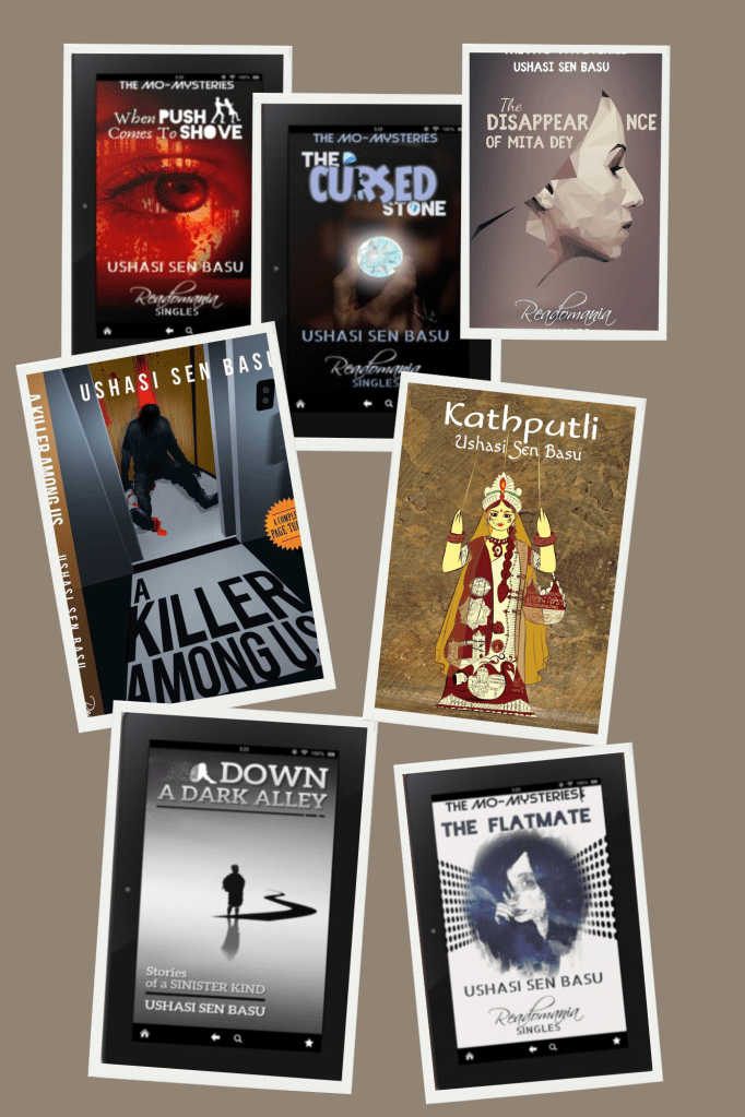 Ushasi is the author of the Mo Mysteries series, with four novellas, ‘When Push Comes to Shove’, ‘The Cursed Stone’, ‘The Flatmate’, and ‘The Disappearance of Mita Dey’ published by Readomania on Kindle. She has also published a collection of short stories called ‘Down a Dark Alley’.