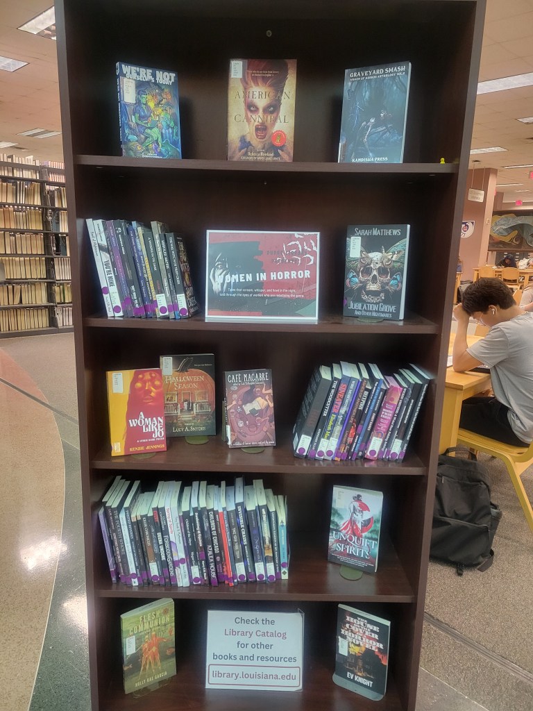 As you may have heard me going on about, the book drive we did for the Edith Garland Dupré Library (University of Louisiana at Lafayette) was a great success! Here are the first pics of the special Women in Horror book section created just for our books! I’m told this is only half of the display and more pics will be on the way, but we can already see what a glorious start we’re off to!